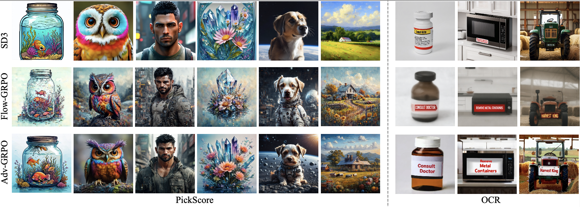 Visualizations under PickScore (left) and OCR (right) rewards. Our method Adv-GRPO effectively mitigates reward hacking in both settings, producing images that better align with human perception while avoiding the degradation commonly observed in baseline reward-optimized models.