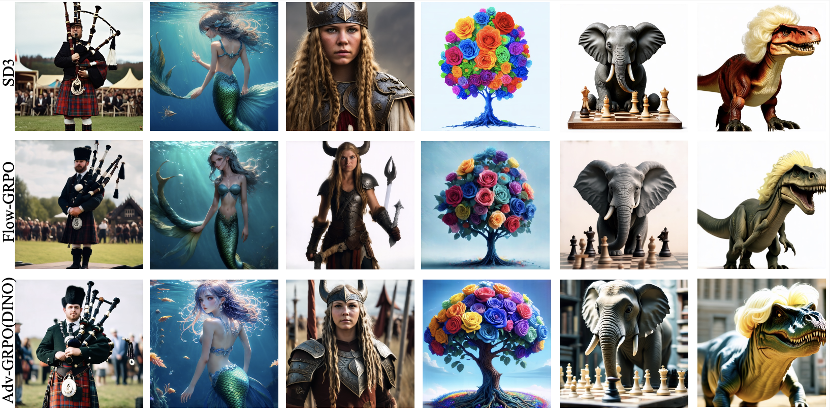 Visualizations using the DINO reward model. With adversarial DINO-based rewards, Adv-GRPO consistently improves overall visual fidelity, demonstrating clearer structure, richer texture, and more coherent semantics compared to baseline methods.