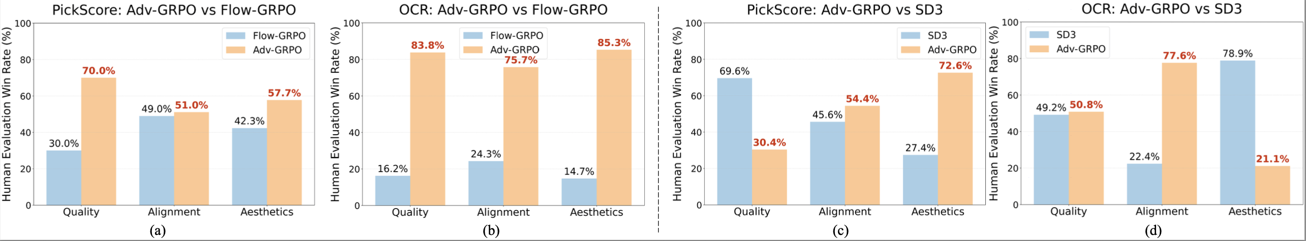 Human evaluation under PickScore- and OCR-based rewards. Our method Adv-GRPO improves image quality and aesthetics with PickScore reward in a), and for all metrics with OCR reward in b). Compared with the original model (SD3), PickScore reward trade-off aesthetic improvements with image quality degradation in c), OCR reward trade-off text-alignment from aesthetics degradation in d).
