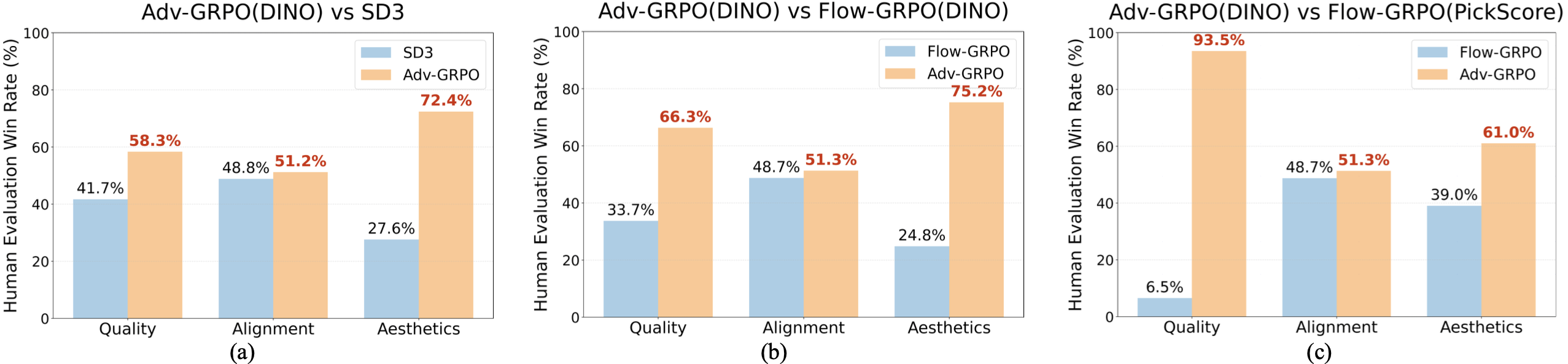 Human evaluation results under the visual foundation model (DINO) reward. Using a foundation model as the reward, our RL method improves image aesthetics, quality, and text alignment compared with the original SD3 model (a), and significantly outperforms Flow-GRPO under the DINO similarity reward (b) and PickScore reward (c).