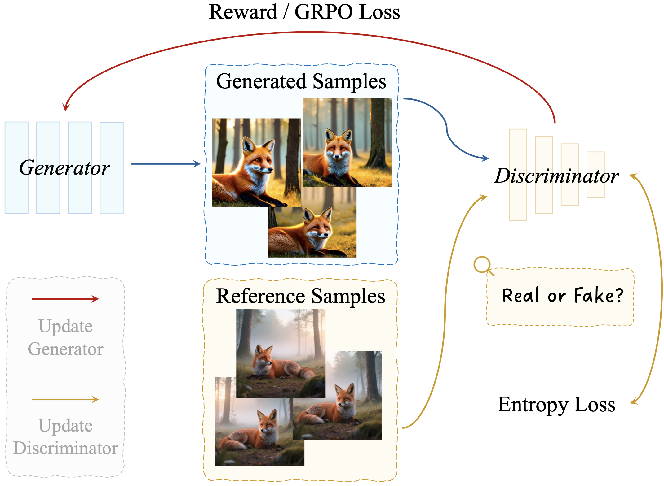 Pipeline of Adv-GRPO. The generator is optimized using the GRPO loss, while the discriminator is trained to distin- guish between generated samples and reference images, treated as negative and positive samples, respectively. The discriminator serves as a reward model to provide feedback for the generator.