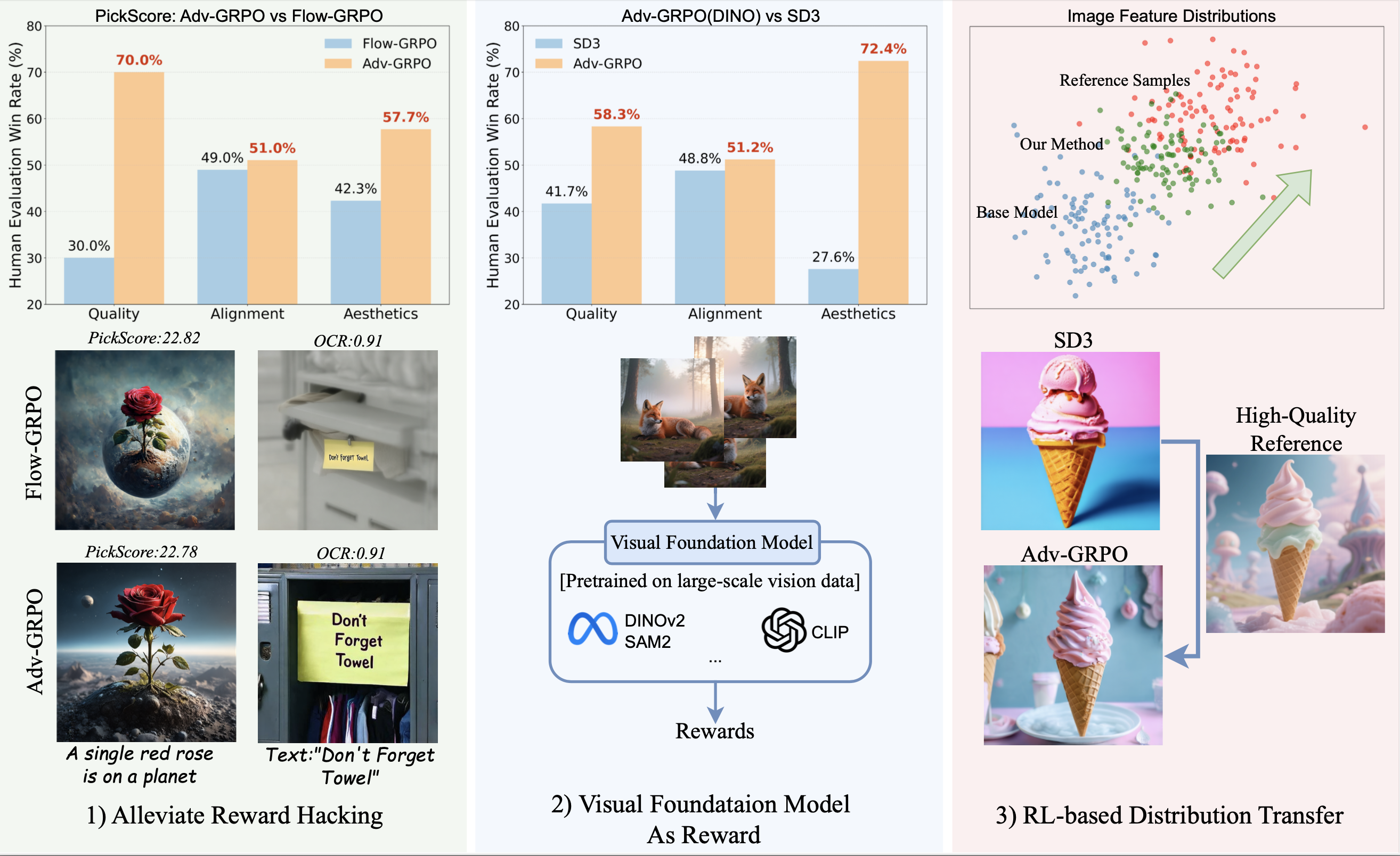Overview of our approach. Our method Adv-GRPO improves text-to-image (T2I) generation in three ways: 1) Alleviate Reward Hacking, achieving higher perceptual quality while maintaining comparable benchmark performance (e.g., PickScore, OCR), as shown in the top-left human evaluation panel; 2) Visual Foundation Model as Reward, leveraging visual foundation models (e.g., DINO) for rich visual priors, leading to overall improvements as shown in the middle-top human evaluation results; 3) RL-based Distribution Transfer, enabling style customization by aligning generations with reference domains.